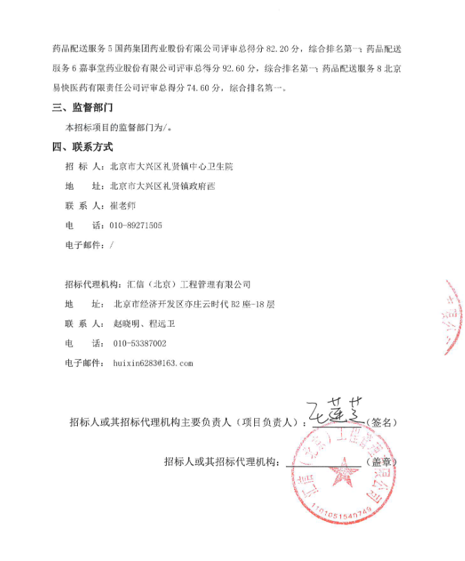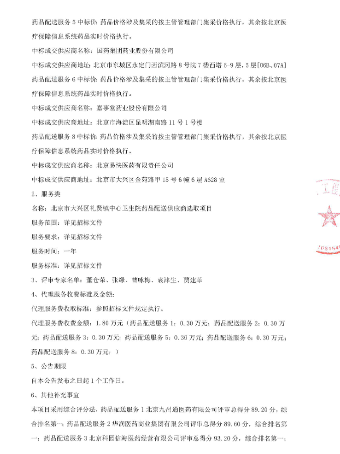【北京市大兴区礼贤镇中心卫生院】北京市大兴区礼贤镇中心卫生院药品配送供应商选取项目中标结果公告