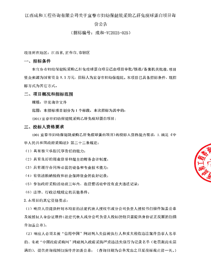 【宜春市妇幼保健院】江西成和工程咨询有限公司关于宜春市妇幼保健院采购乙肝免疫球蛋白项目询价公告