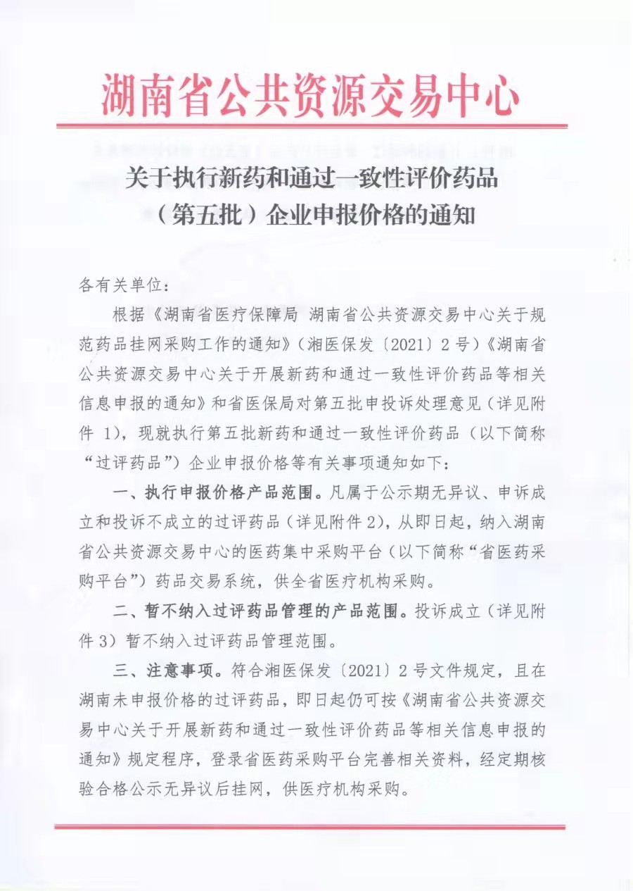 【湖南】湖南省关于执行新药和通过一致性评价药品(第五批)企业申报价格的通知