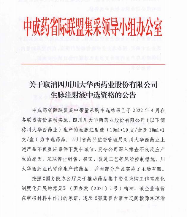 【湖北】关于取消四川川大华西药业股份有限公司生脉注射液中选资格的公告