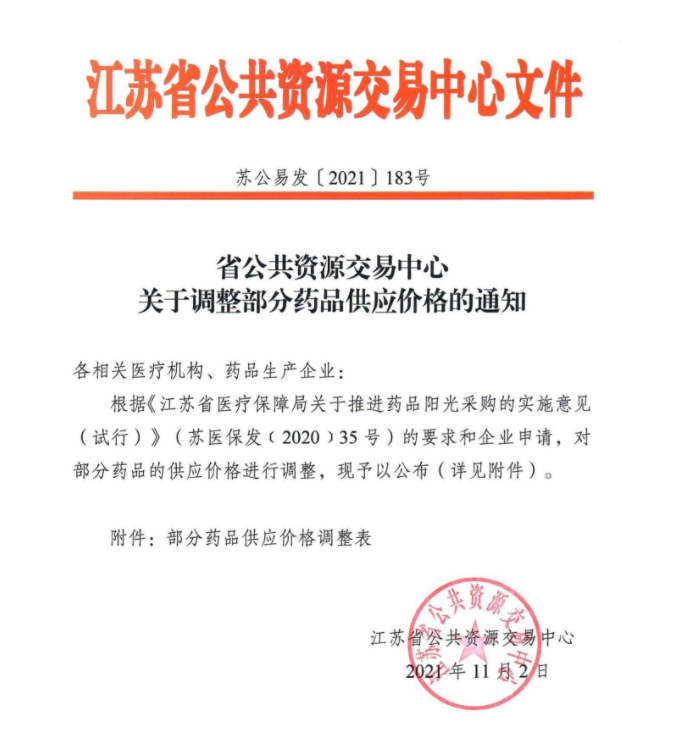 【江苏】2021年江苏省公共资源交易中心关于调整部分药品供应价格的通知 苏公易发[2021]183号