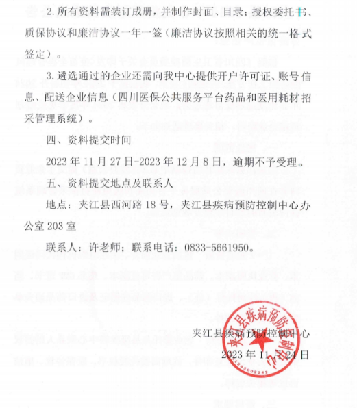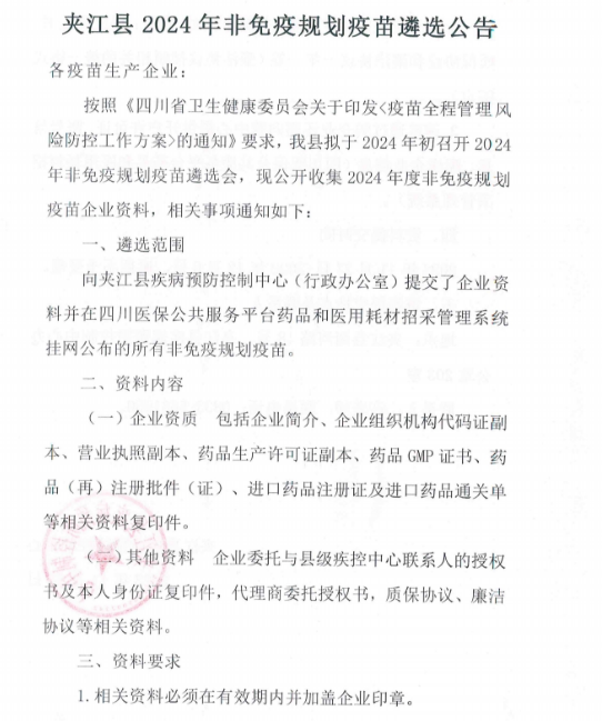 按照《四川省卫生健康委员会关于印发<疫苗全程管理风险防控工作方案>的通知》要求,我县拟于2024年初召开2024年非免疫规划疫苗遗选会,现公开收集2024年度非免疫规划疫苗企业资料,相关事项通知如下: