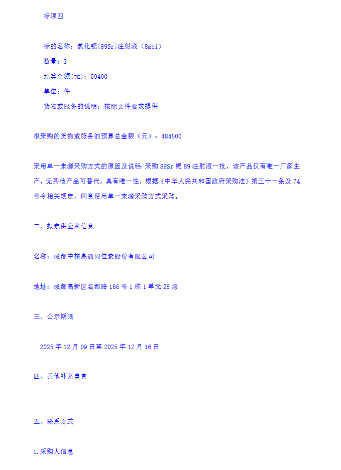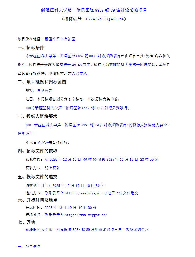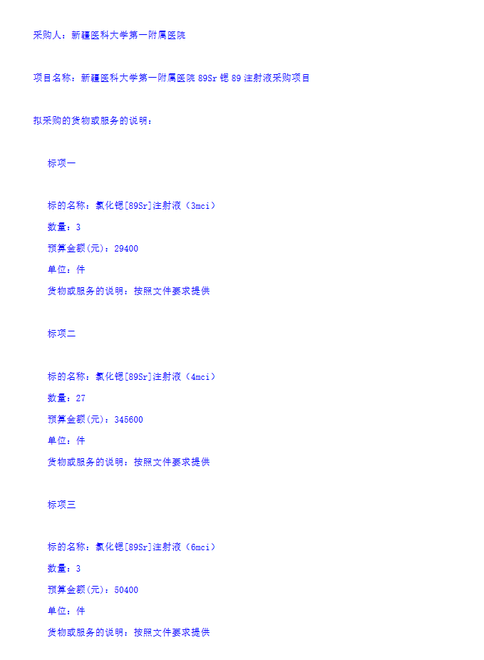【新疆医科大学第一附属医院】新疆医科大学第一附属医院89Sr锶89注射液采购项目