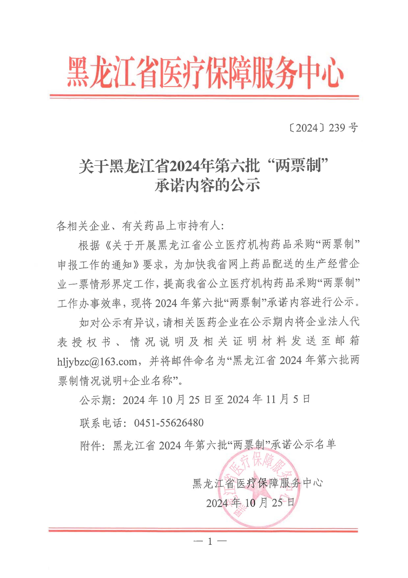 【黑龙江】关于黑龙江省2024年第六批“两票制”承诺内容的公示