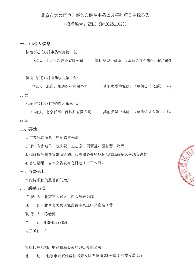 【北京市大兴区中西医结合医院】北京市大兴区中西医结合医院中药饮片采购项目中标公告