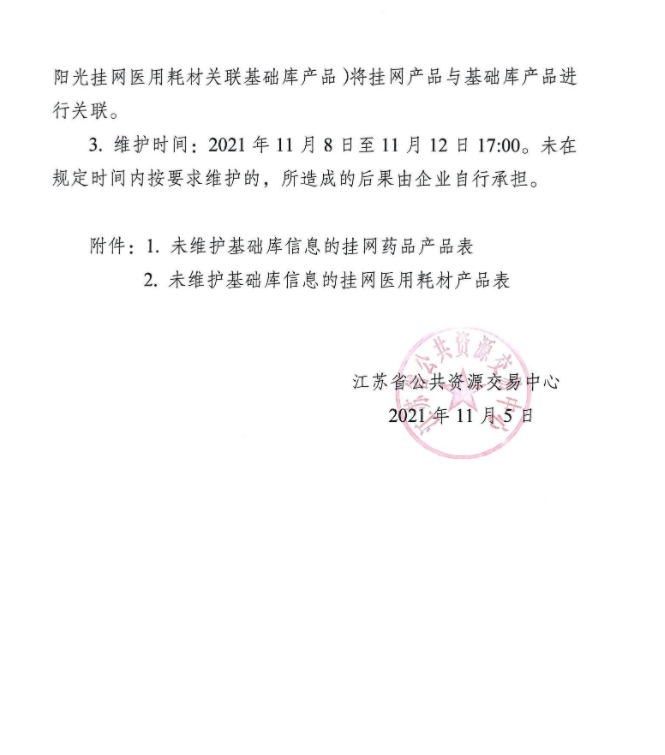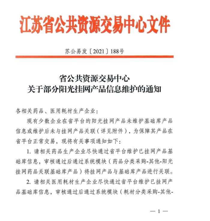 【江苏】2021年江苏省公共资源交易中心关于部分阳光挂网产品信息维护的通知 苏公易发[2021]188号