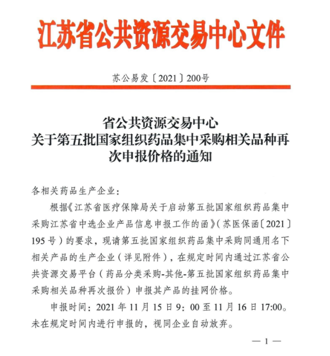 【江苏】江苏省公共资源交易中心关于第五批国家组织药品集中采购相关品种再次申报价格的通知