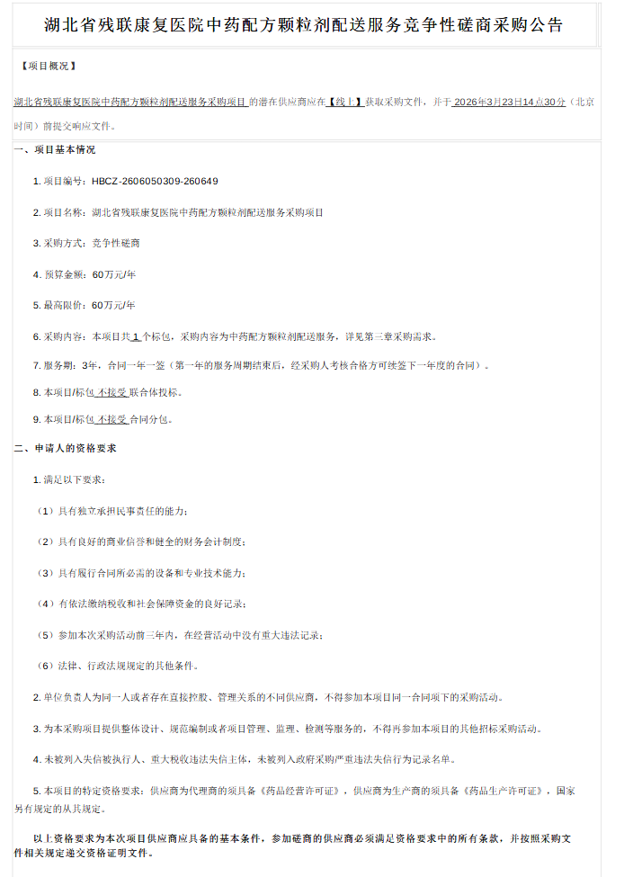 【湖北省残联康复医院】湖北省残联康复医院中药配方颗粒剂配送服务采购项目
