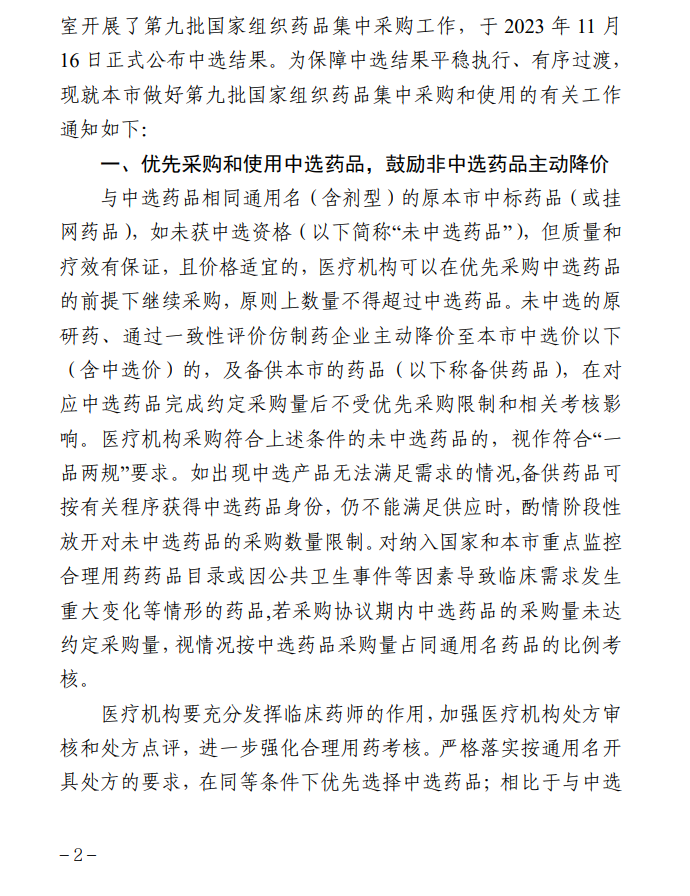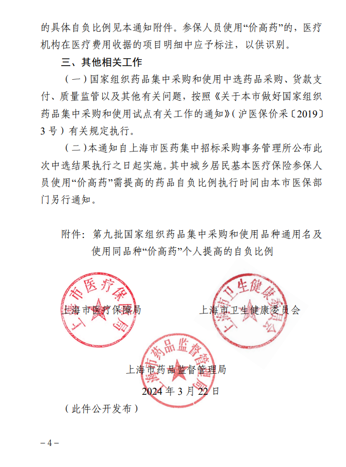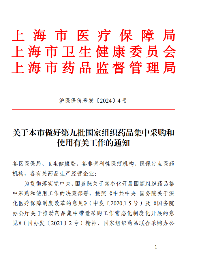 【上海】关于本市做好第九批国家组织药品集中采购和使用有关工作的通知沪医保价采发〔2024〕4号
