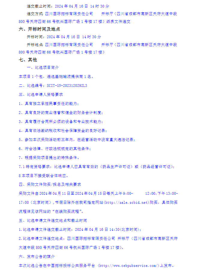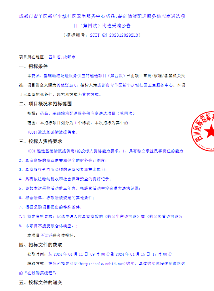 【成都市青羊区新华少城社区卫生服务中心】四川省成都市青羊区新华少城社区卫生服务中心药品、基础输液配送服务供应商遴选项目(第四次)比选采购公告