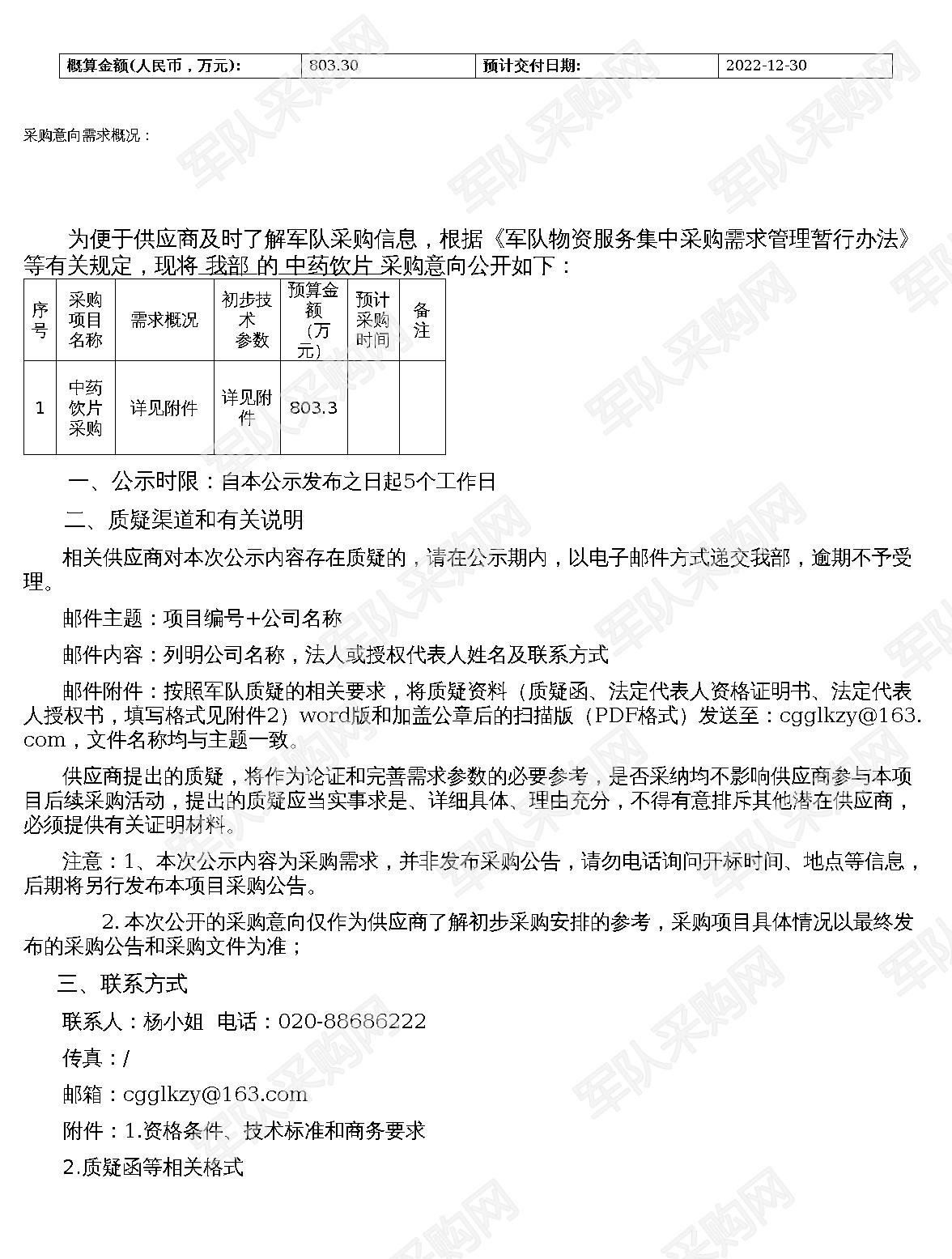 【军队采购网】中药饮片采购意向公开(2022-JQ20-W1036)