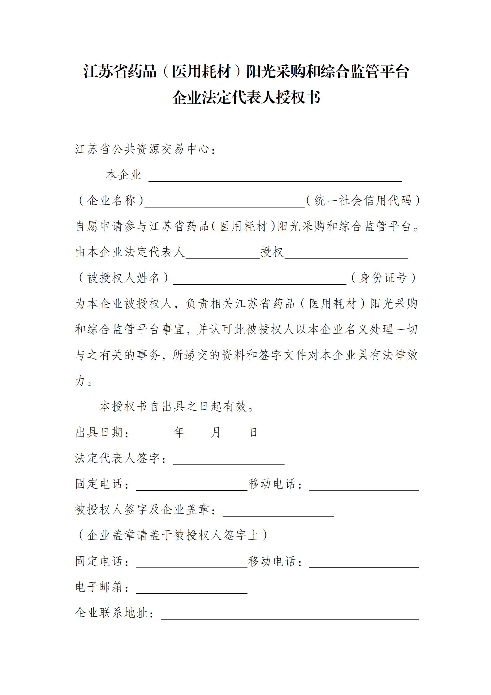 【江苏】企业法定代表人授权书