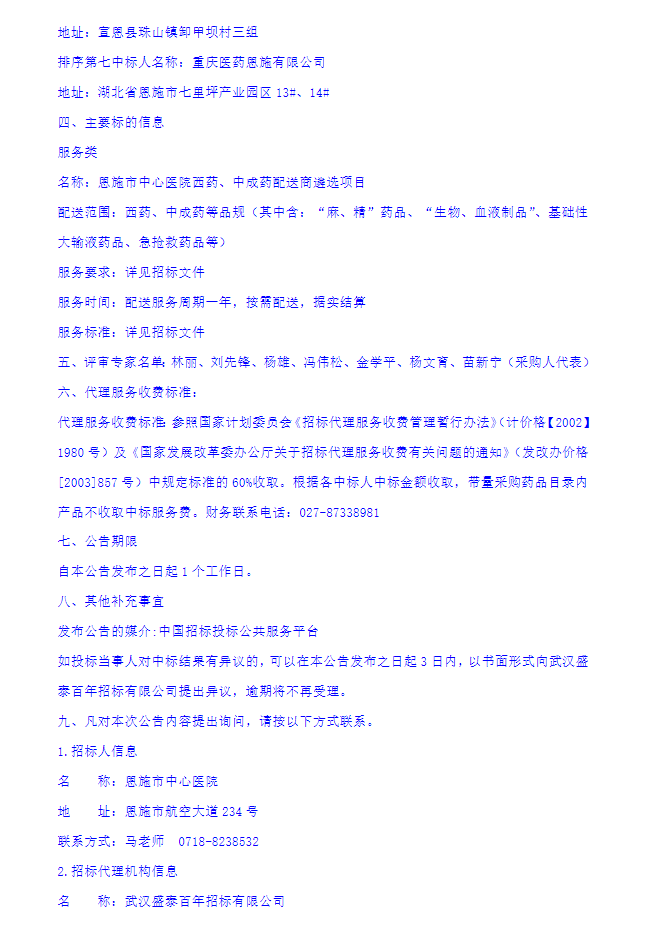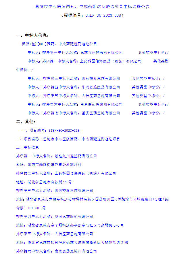【恩施市中心医院】湖北省恩施土家族苗族自治州恩施市中心医院西药、中成药配送商遴选项目中标结果公告
