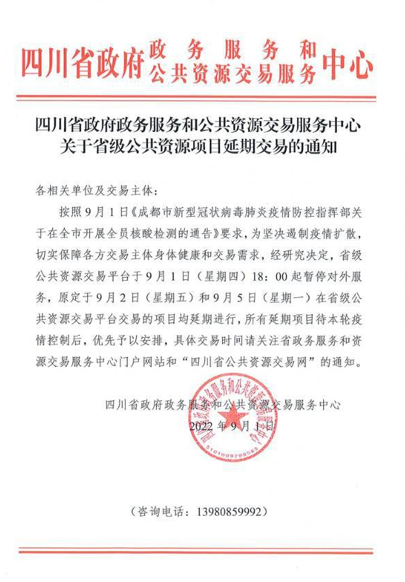 【四川】四川省药械采购及医药价格监管平台转发四川省政府政务服务和公共资源交易服务中心关于省级公共资源项目延期交易的通知