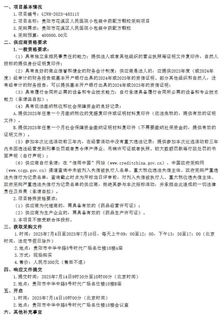 【贵阳市花溪区人民医院】贵州省贵阳市花溪区人民医院小包装中药配方颗粒采购项目竞争性磋商公告