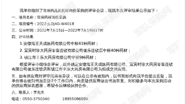 【军队】常用药材采购结果公示 (2022-JLDJAG-W4018)