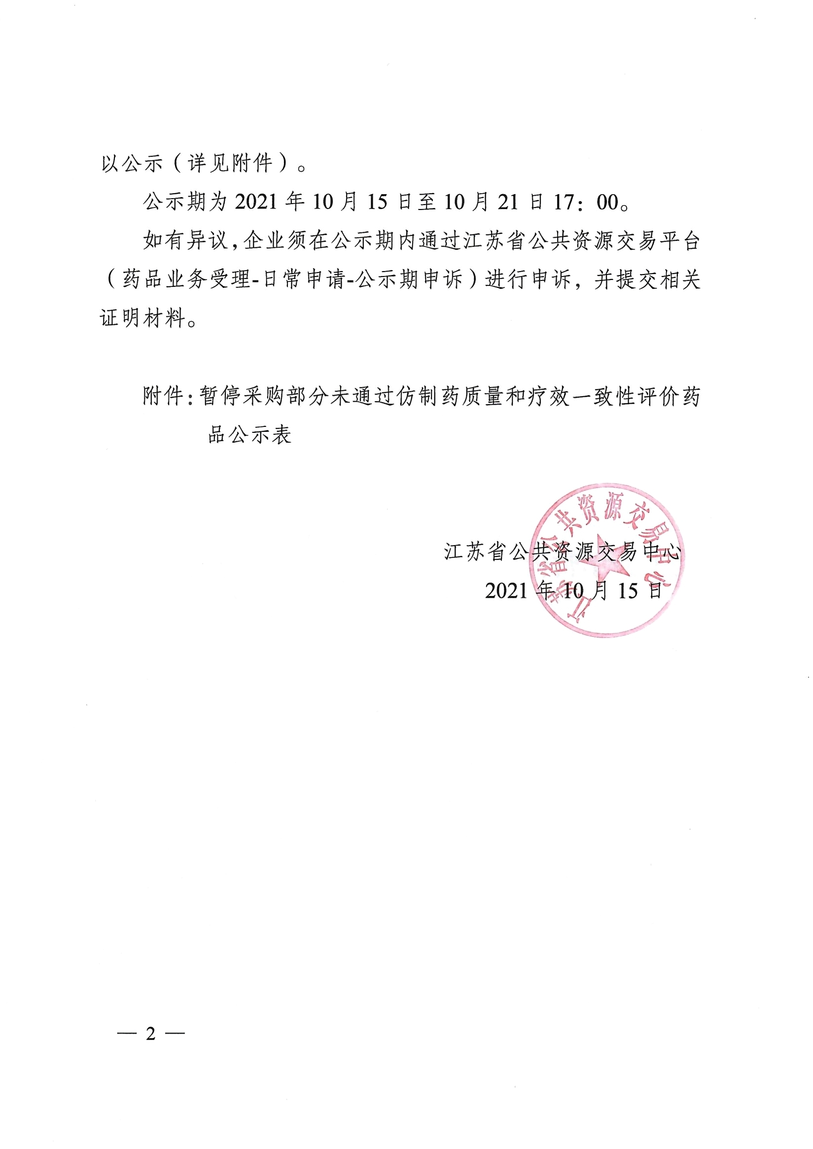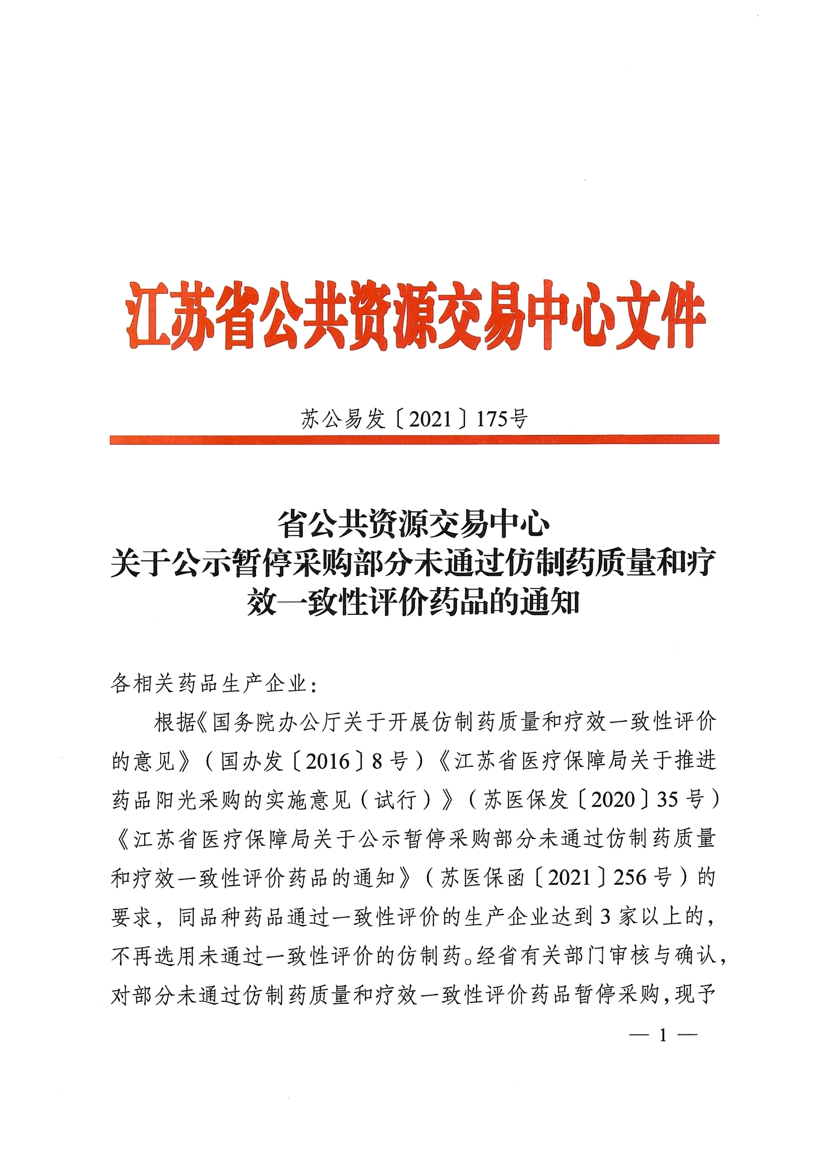【江苏】江苏省公共资源交易中心关于公示暂停采购部分未通过仿制药质量和疗效一致性评价药品的通知