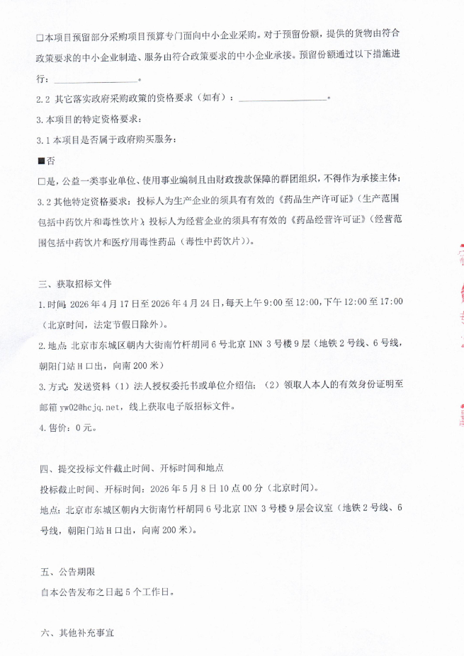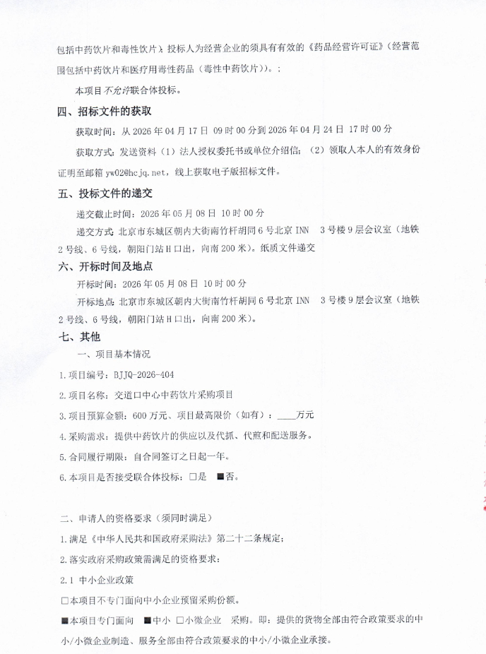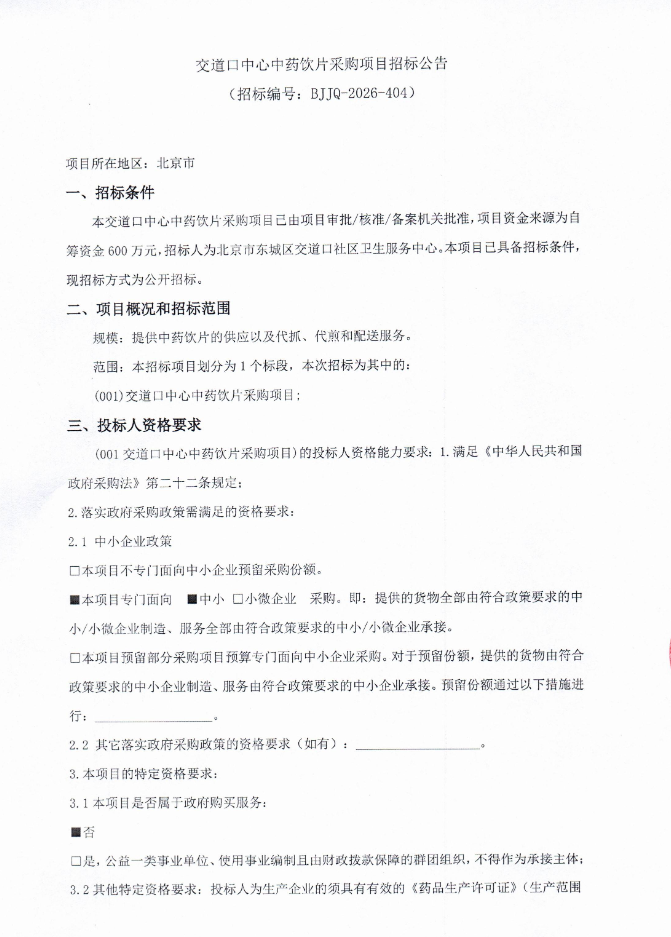 【北京市东城区交道口社区卫生服务中心】北京市东城区交道口社区卫生服务中心中药饮片采购项目招标公告