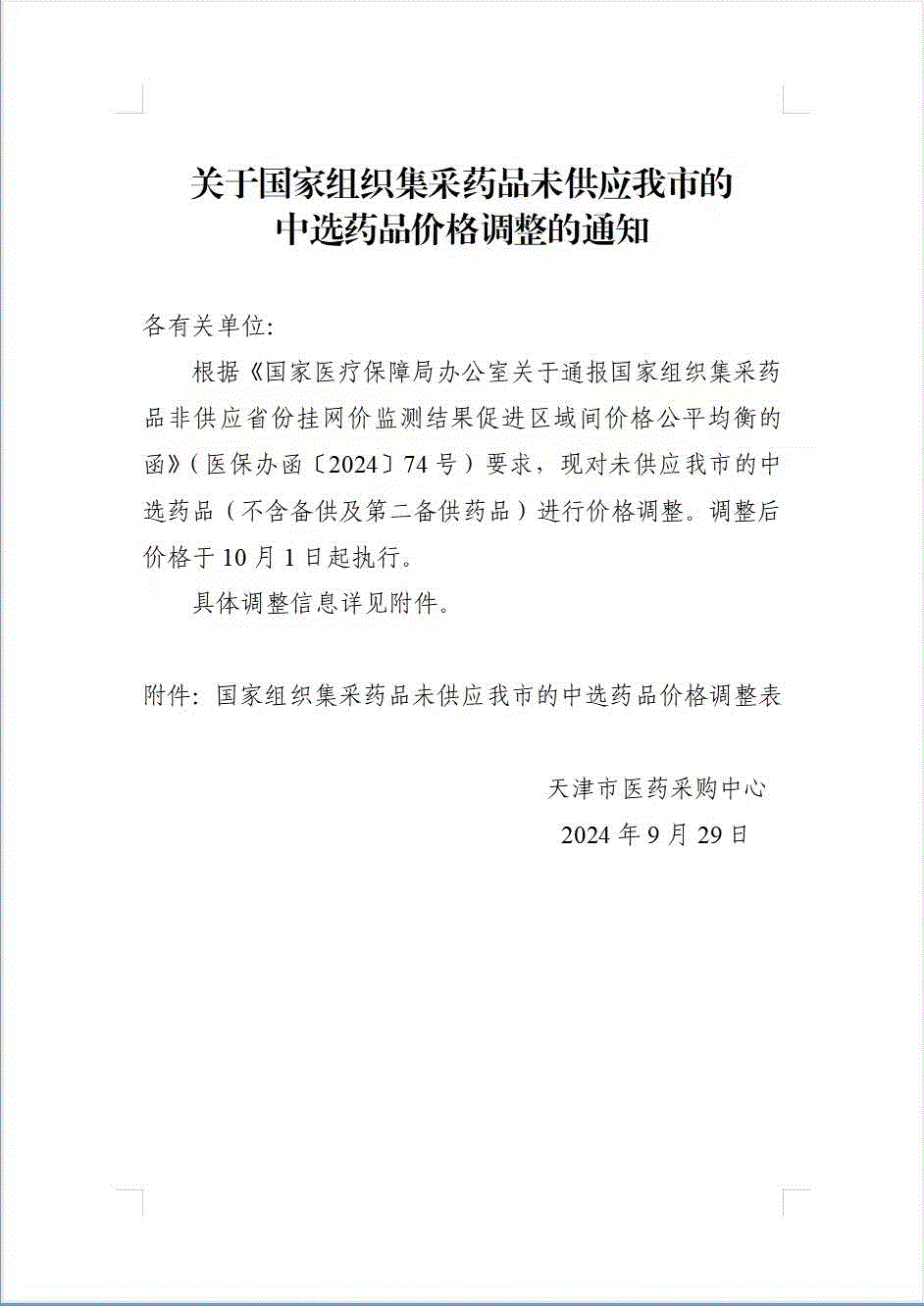 【天津】天津市关于国家组织集采药品未供应我市的中选药品价格调整的通知