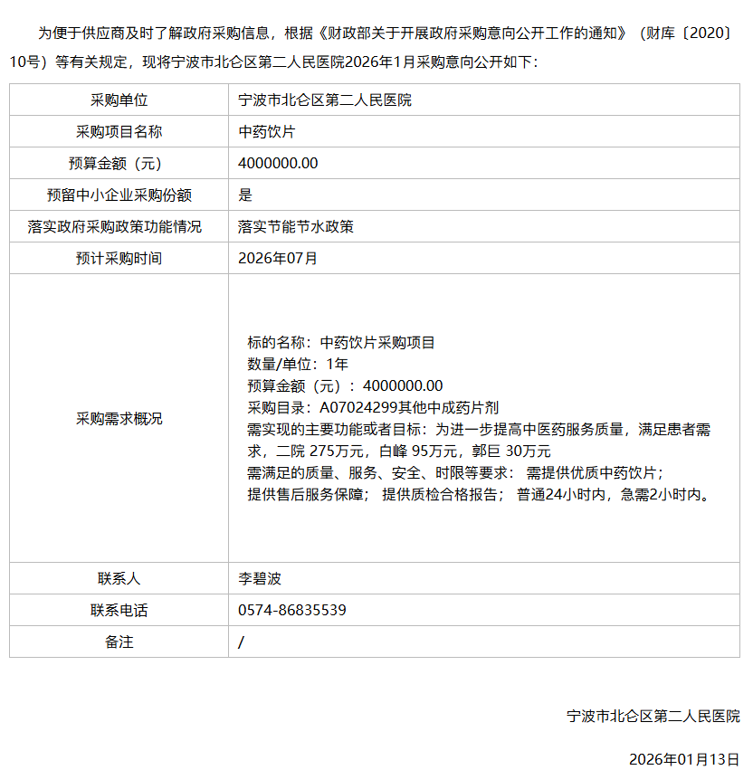 【宁波市北仑区第二人民医院】浙江省宁波市北仑区第二人民医院2026年1月政府采购意向2
