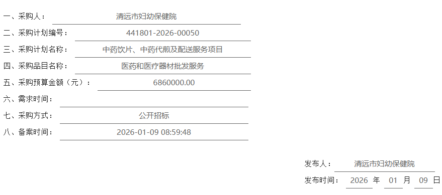 【清远市妇幼保健院】广东省清远市妇幼保健院中药饮片、中药代煎及配送服务项目