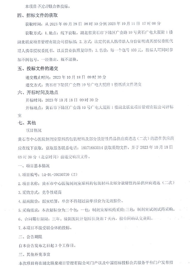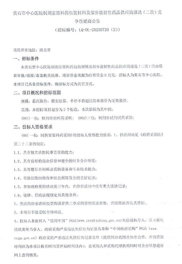 【黄石市中心医院】湖北省黄石市中心医院制剂室原料药包装材料及部分放射性药品供应商遴选(二次)竞争性磋商公告