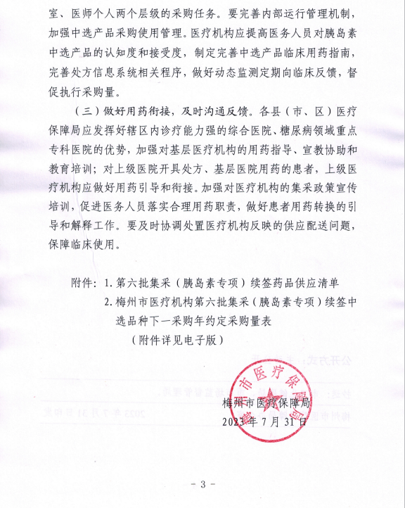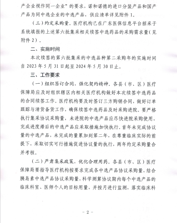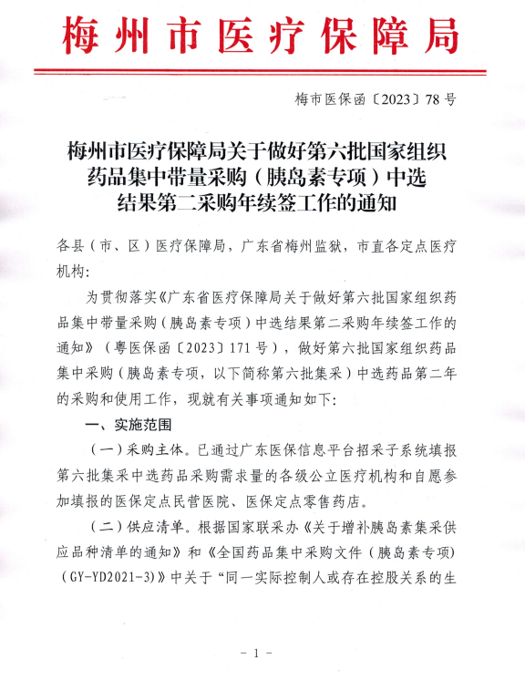 为贯彻落实《广东省医疗保障局关于做好第六批国家组织药品集中带量采购(胰岛素专项)中选结果第二采购年续签工作的通知》(粤医保函〔2023〕171号),做好第六批国家组织药品集中采购(胰岛素专项,以下简称第六批集采)中选药品第二年的采购和使用工作,现就有关事项通知如下: