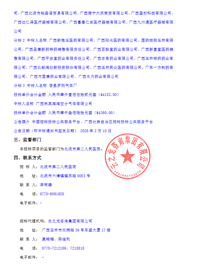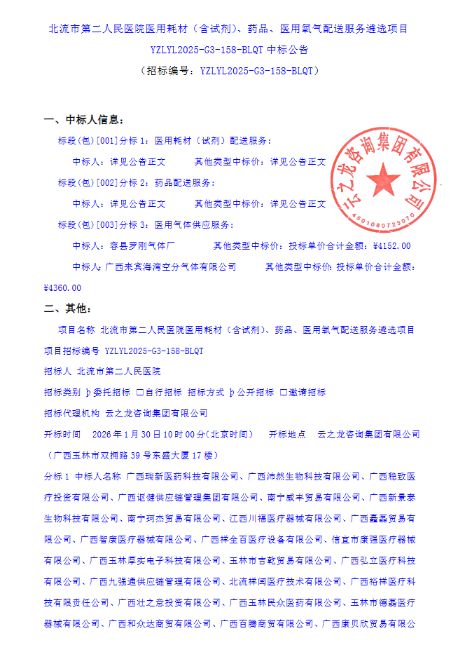 【玉林市北流市第二人民医院】广西壮族自治区玉林市北流市第二人民医院医用耗材(含试剂)、药品、医用氧气配送服务遴选项目YZLYL2025-G3-158-BLQT中标公告
