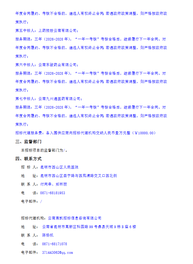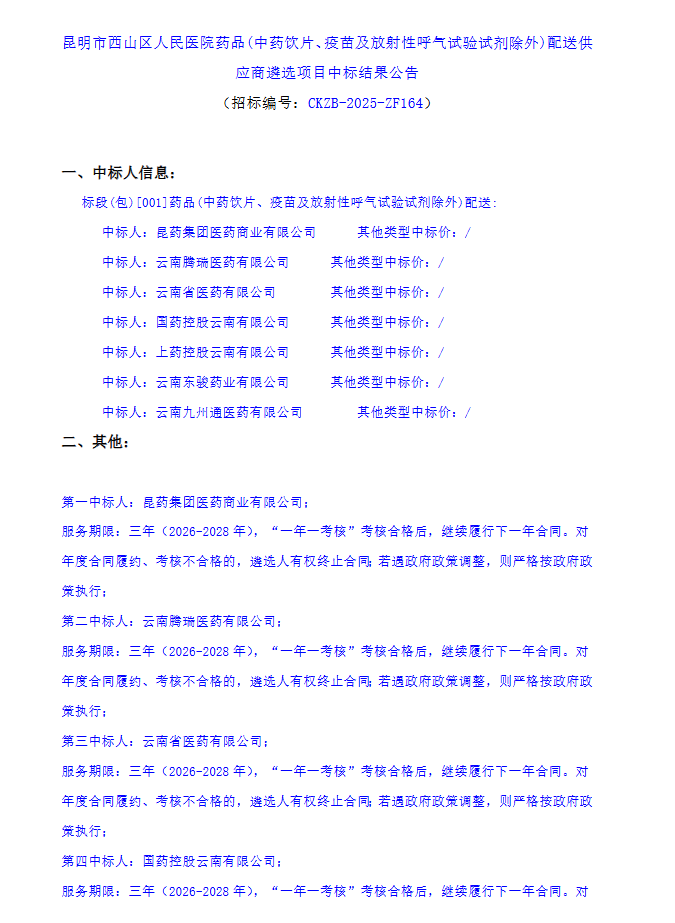 【昆明市西山区人民医院】云南省昆明市西山区人民医院药品(中药饮片、疫苗及放射性呼气试验试剂除外)配送供应商遴选项目中标结果公告