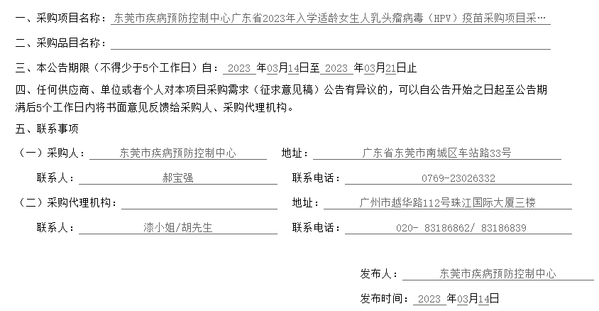 【东莞市疾病预防控制中心】广东省东莞市疾病预防控制中心广东省2023年入学适龄女生人乳头瘤病毒(HPV)疫苗采购项目采购需求征求意见公告
