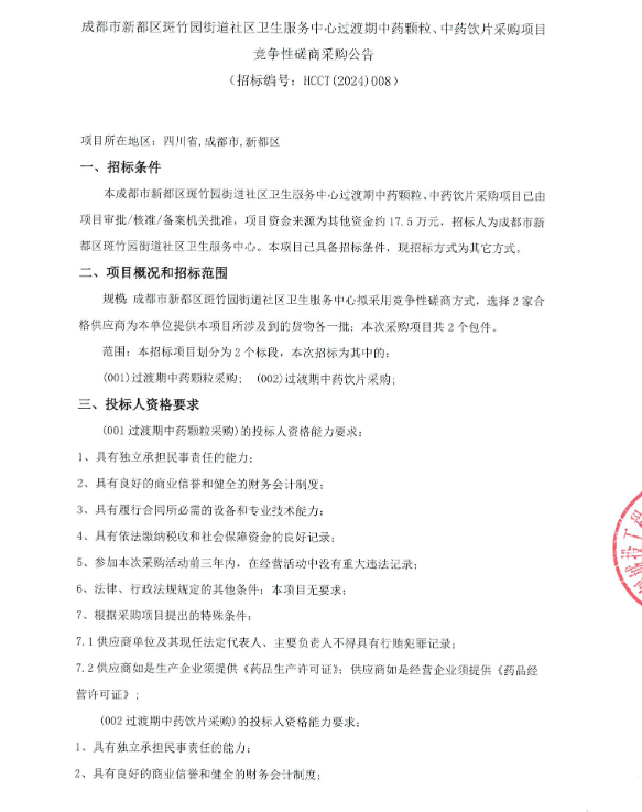【成都市新都区斑竹园街道社区卫生服务中心】四川省成都市新都区斑竹园街道社区卫生服务中心过渡期中药颗粒、中药饮片采购项目竞争性磋商采购公告