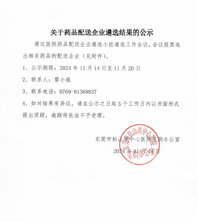【东莞市松山湖中心医院】广东省东莞市松山湖中心医院关于药品配送企业遴选结果的公示