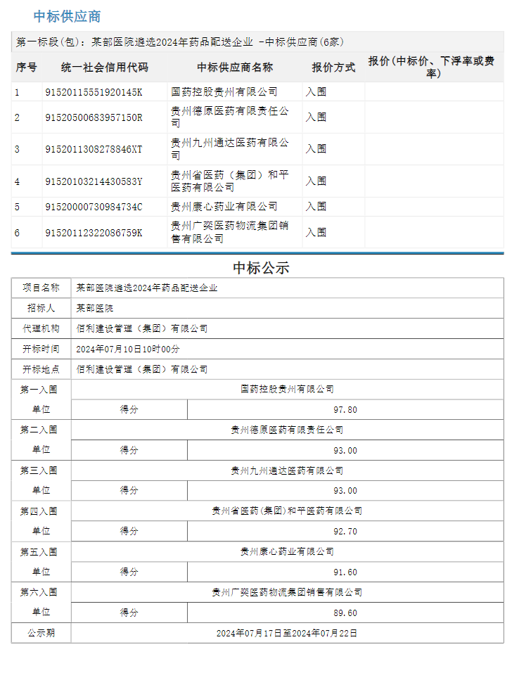 【军队采购】军队某部医院遴选2024年药品配送企业中标公示