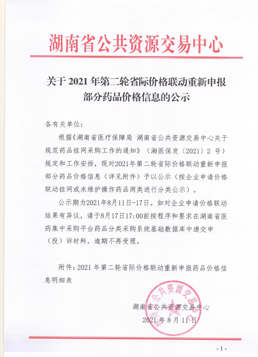 【湖南】2021年湖南省关于2021年第二轮省际价格联动重新申报部分药品价格信息的公示