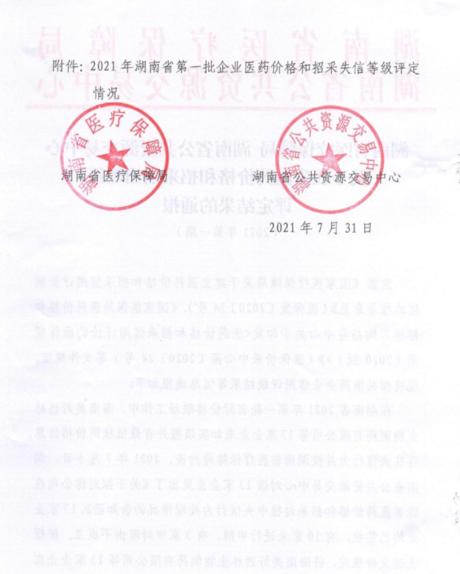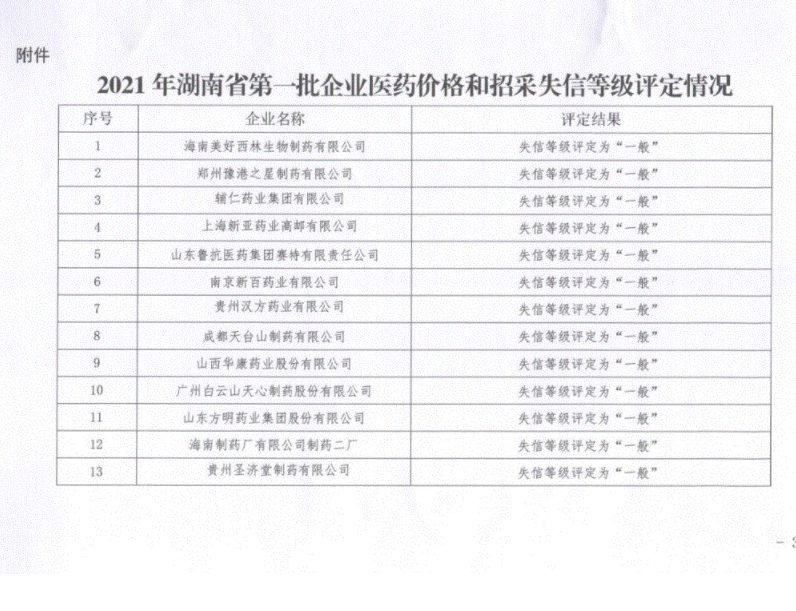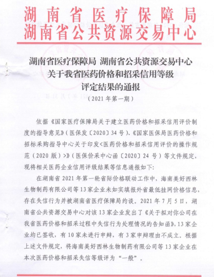 【湖南】关于湖南省医药价格和招采信用等级评定结果的通报(2021年第一期)