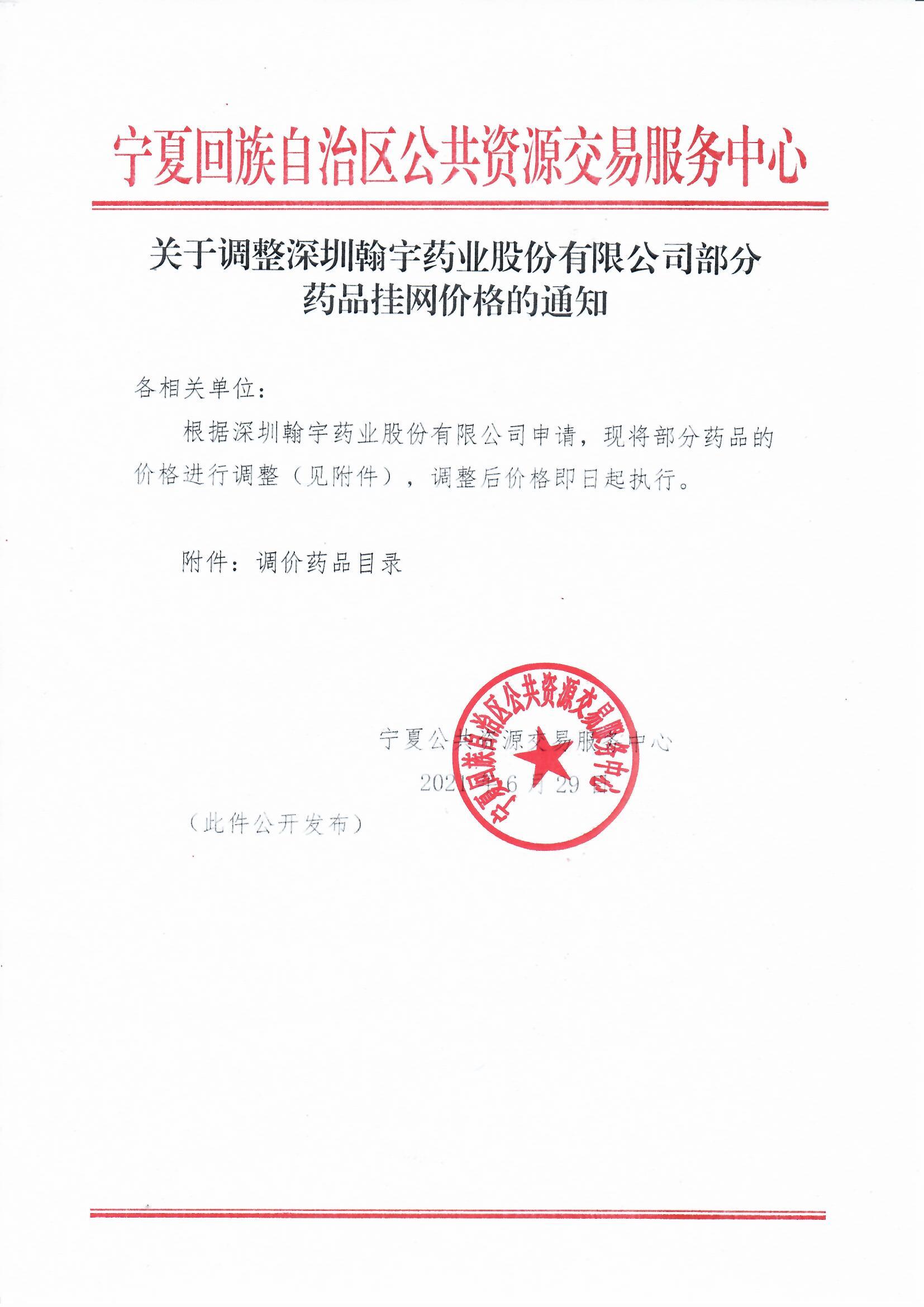 【宁夏】2021年宁夏自治区关于调整深圳翰宇药业股份有限公司部分药品挂网价格的通知