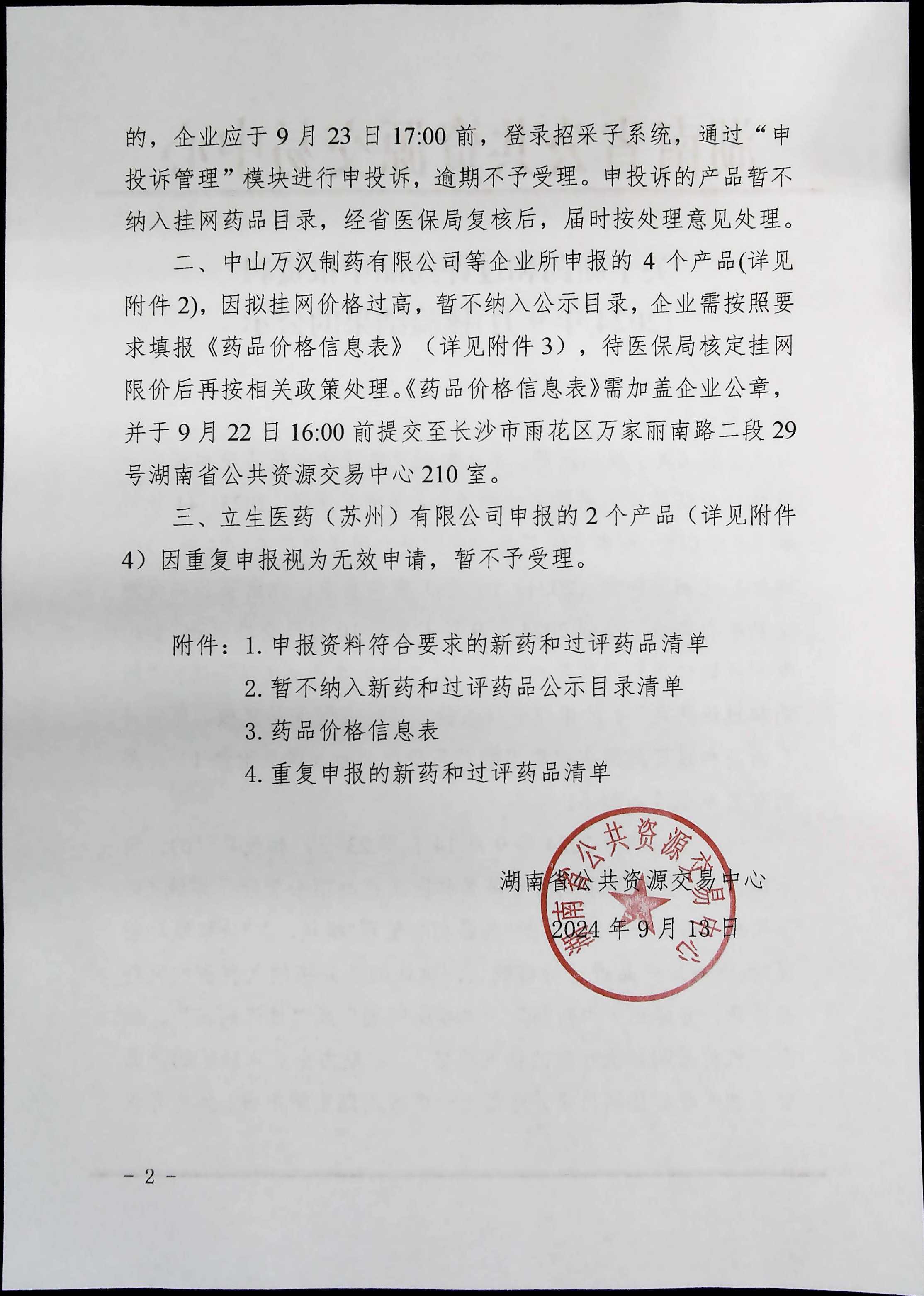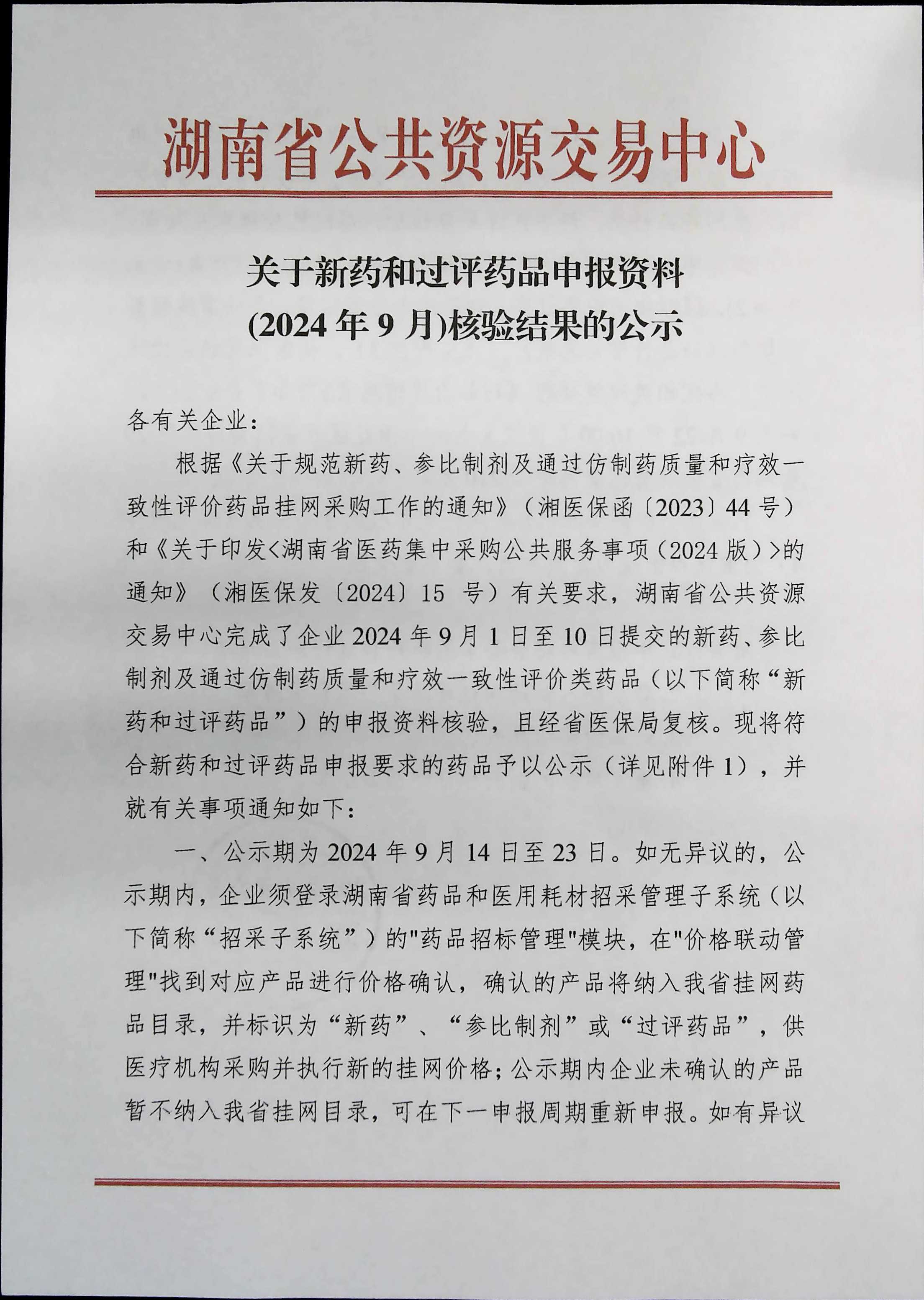 根据《关于规范新药、参比制剂及通过仿制药质量和疗效一致性评价药品挂网采购工作的通知》(湘医保函(2023)44号)和《关于印发<湖南省医药集中采购公共服务事项(2024版)>的通知》(湘医保发〔2024)15号〕有关要求,湖南省公共资源交易中心完成了企业2024年9月1日至10日提交的新药、参比制剂及通过仿制药质量和疗效一致性评价类药品(以下简称“新药和过评药品”)的申报资料核验,且经省医保局复核。现将符合新药和过评药品申报要求的药品予以公示(详见附件1),并就有关事项通知如下: