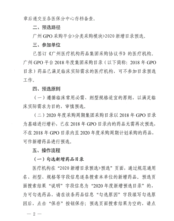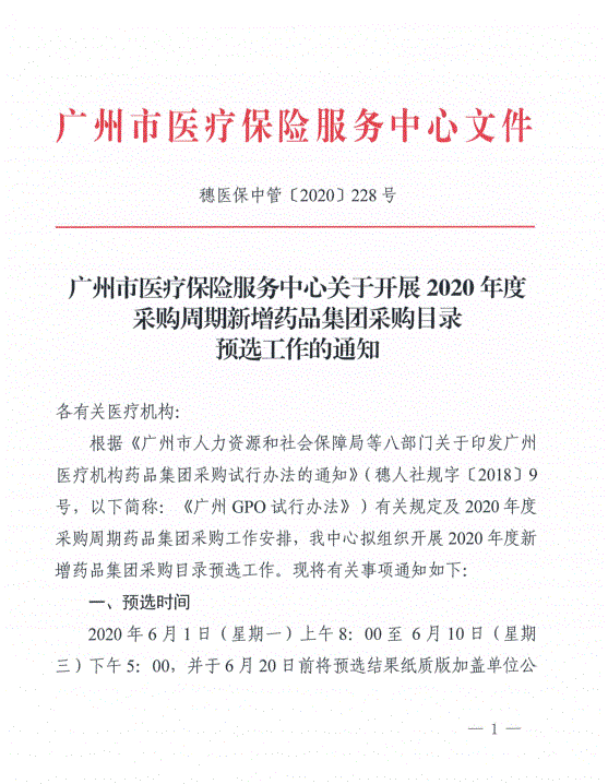 【广州】广东省广州市医疗保险服务中心关于开展2020年度采购周期新增药品集团采购目录预选工作的通知