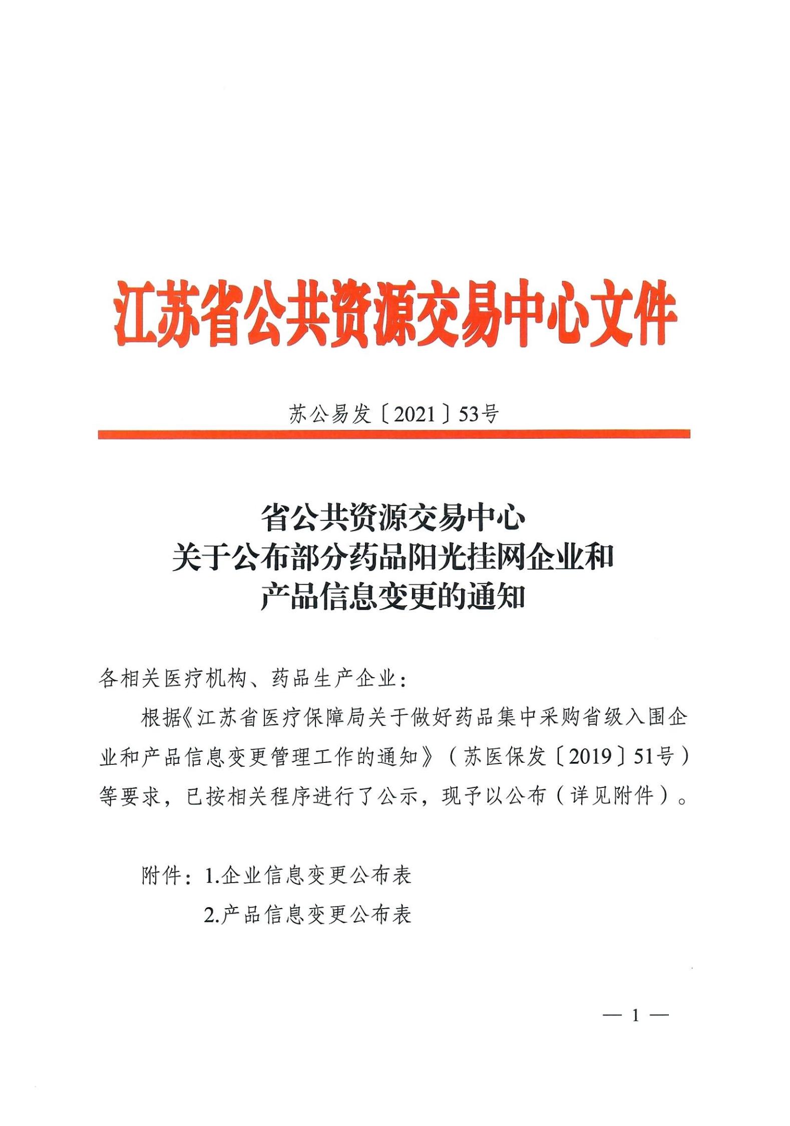 【江苏】2021年江苏省公共资源交易中心关于公布部分药品阳光挂网企业和产品信息变更的通知 苏公易发[2021]53号