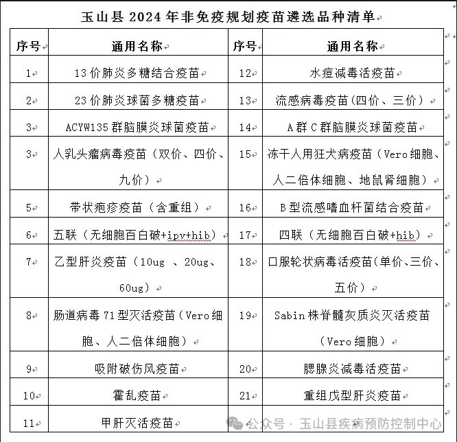为进一步规范玉山县非免疫规划疫苗的采购和供应工作,满足辖区内疾病控制和群众健康需求。本着公平、公开、公正的原则,坚持接种常用、群众需求,效高价廉,不良反应少,服务优质的宗旨,根据《玉山县非免疫规划疫苗采购评审实施方案》(2023年),现就玉山县2024年非免疫规划疫苗遴选工作公告如下: