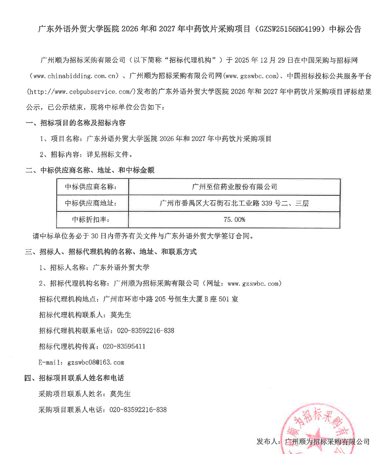 【广东外语外贸大学】广东外语外贸大学医院2026年和2027年中药饮片采购项目(GZSW25156HG4199)中标公告