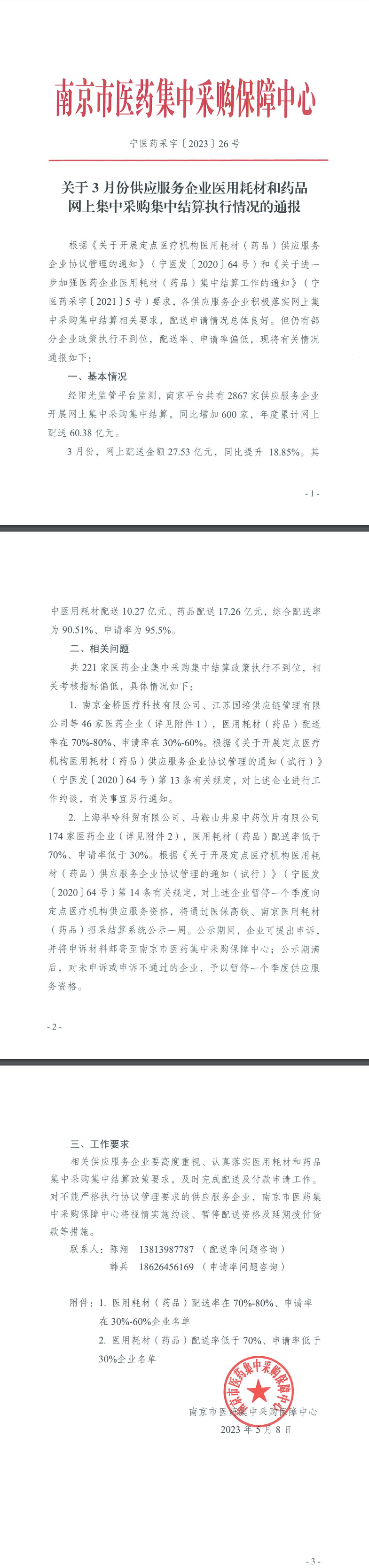 1.南京金桥医疗科技有限公司、江苏国培供应链管理有限公司等46家医药企业(详见附件1),医用耗材(药品)配送率在70%-80%、申请率在30%-60%。根据《关于开展定点医疗机构医用耗材(药品)供应服务企业协议管理的通知(试行)》(宁医发〔2020〕64号)第13条有关规定,对上述企业进行工作约谈,有关事宜另行通知。