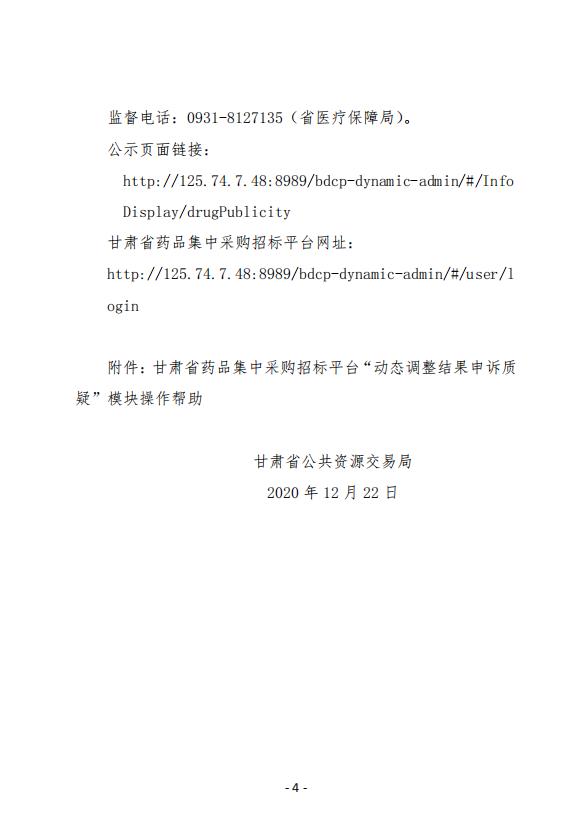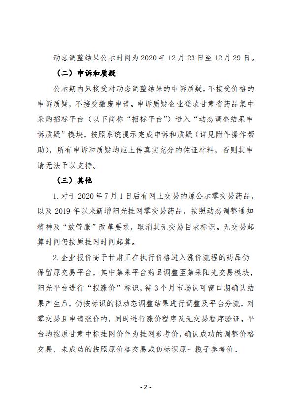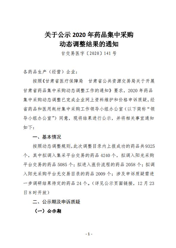【甘肃】甘肃省关于公示2020年药品集中采购动态调整结果的通知 甘交易医字〔2020〕141 号