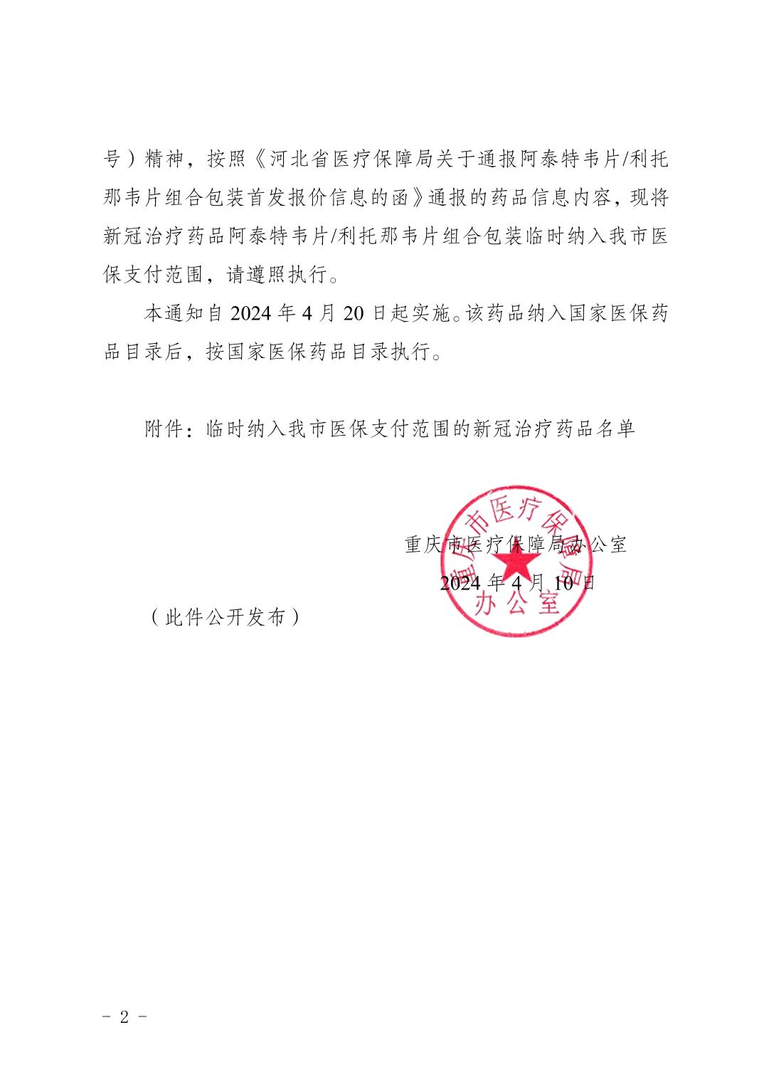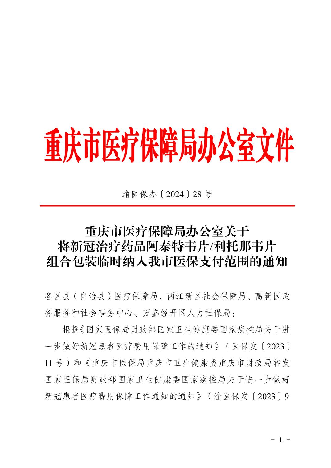 【重庆】重庆市医疗保障局办公室关于将新冠A类药品阿泰特韦片利托那韦片组合包装纳入医保支付的通知
