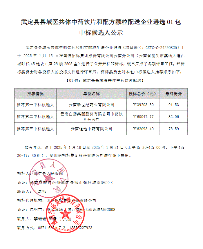 【楚雄彝族自治州武定县人民医院】云南省楚雄彝族自治州〔武定县县域医共体中药饮片和配方颗粒配送企业遴选〕01包中标候选人公示