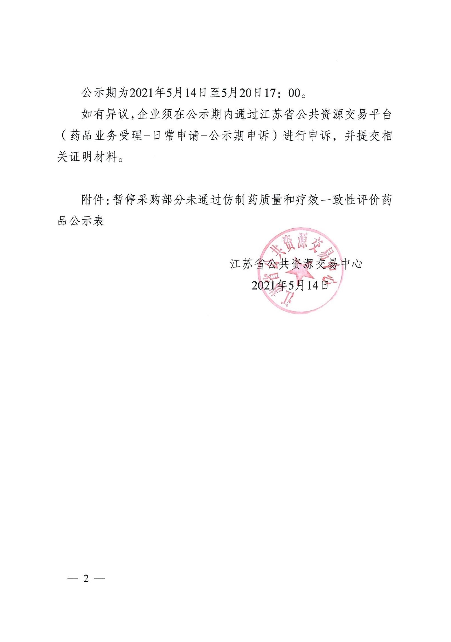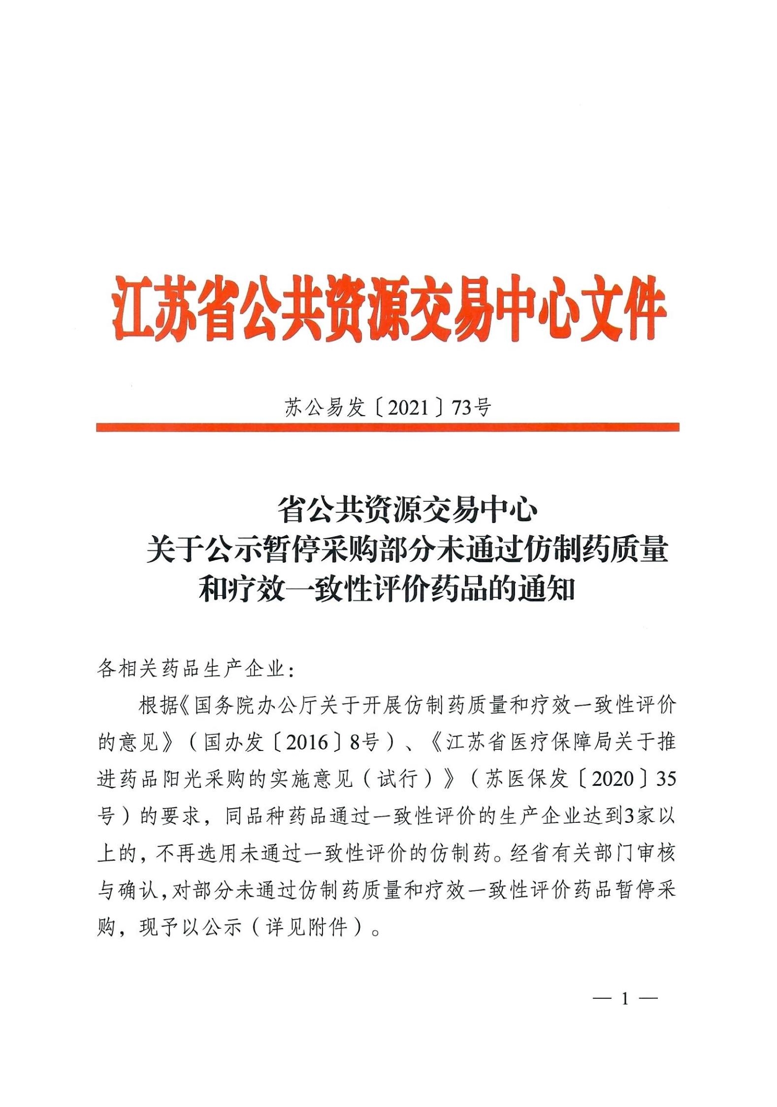 【江苏】2021年江苏省公共资源交易中心关于公示暂停采购部分未通过仿制药质量和疗效一致性评价药品的通知 苏公易发[2021]73号