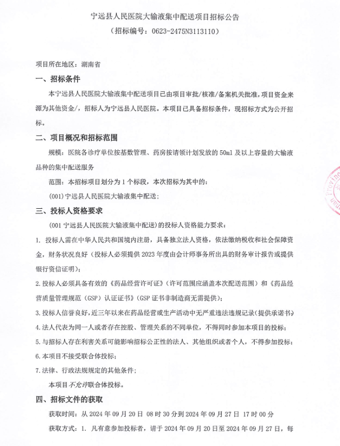 【永州市宁远县人民医院】湖南省永州市宁远县人民医院大输液集中配送项目招标公告