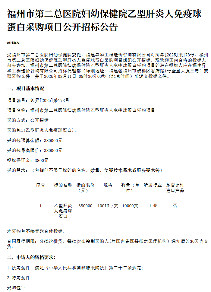 【福州市第二总医院】福建省福州市第二总医院妇幼保健院乙型肝炎人免疫球蛋白采购项目公开招标公告