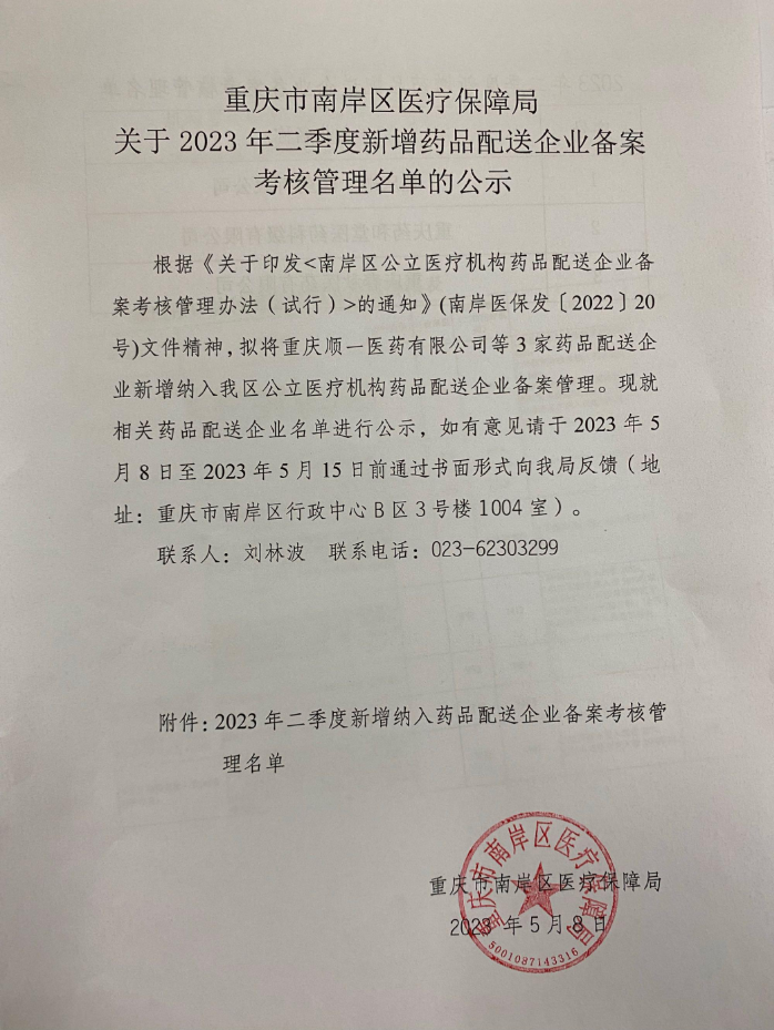 【重庆】南岸区医疗保障局关于2023年二季度新增药品配送企业备案考核管理名单的公示