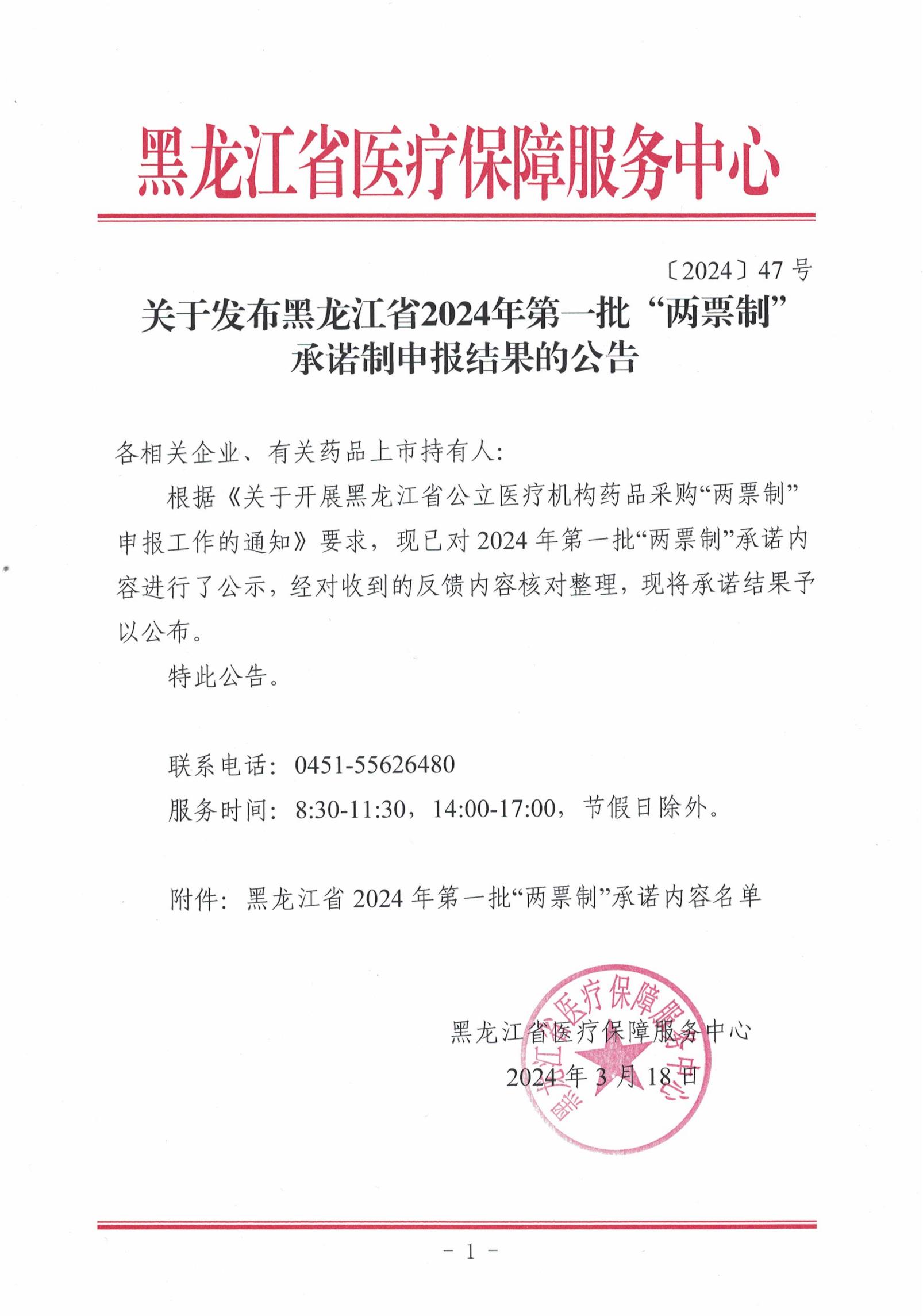 【黑龙江】关于发布黑龙江省2024年第一批“两票制“承诺制申报结果的公告